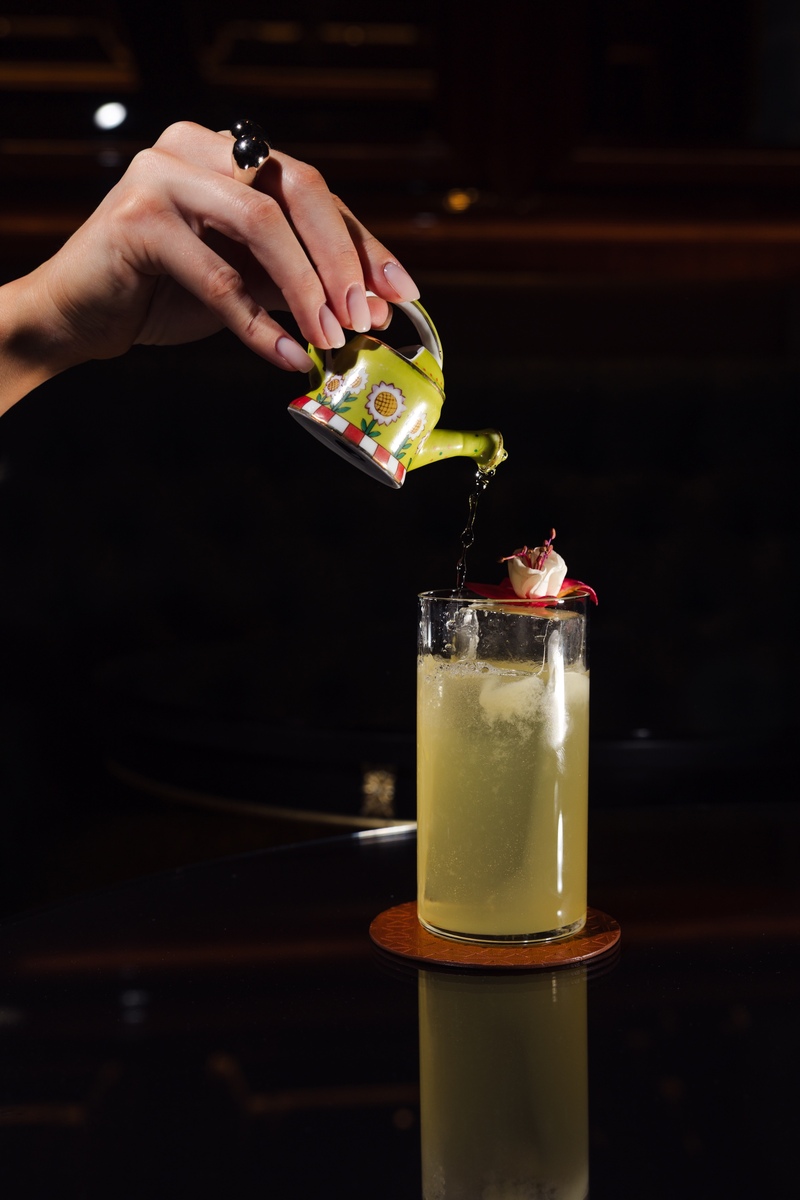 Цветной бульвар соединяет в себе контрасты — от детского смеха до насыщенной истории района. Классическое сочетание маракуйи, водки и игристого здесь становится более тонким: настой на мелиссе добавляет мягкость, а апельсиновый ликер — ароматическую глубину. Подача сопровождается миниатюрной керамической лейкой с просекко.