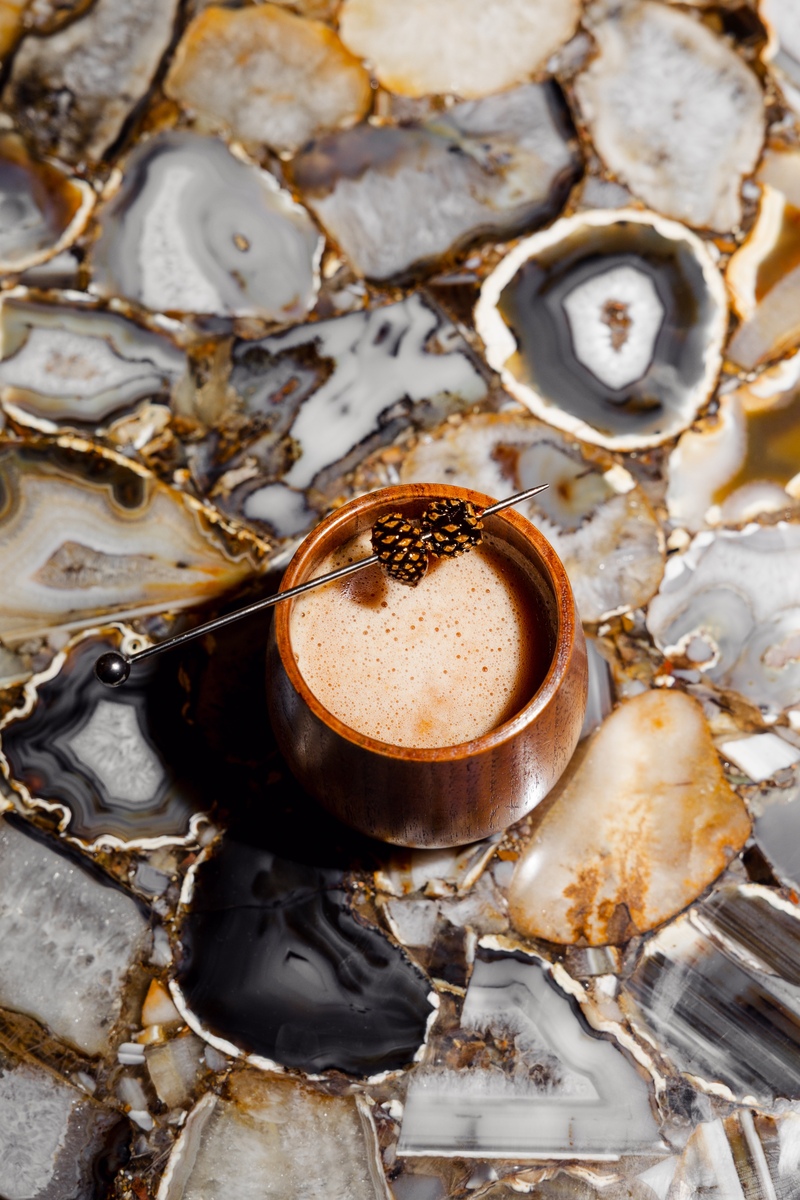 Охотный ряд обращается к образу старой Москвы — насыщенной, щедрой и многослойной. Настой виски на белых грибах создает глубокую основу, морошка добавляет кислинку, а шишки — смолистый акцент. Это плотный, выразительный коктейль с характером.